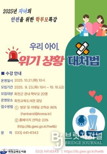 브릿지저널 윤나영 기자 | 화천교육도서관은 10월 21일 10시, 화천군 관내 학부모를 대상으로 학부모 소통(疏通) 프로그램 ‘우리 아이, 위기 상황 대처’ 특강을 운영한다.