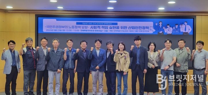 브릿지저널 윤나영 기자 | 전북특별자치도의회 의원 연구단체 ‘기업하기 좋은 전북’(대표위원 서난이)은 23일 전북자치도청 중회의실에서 ‘사회적 책임 실현을 위한 산업안전정책 모색’이라는 주제로 정책토론회를 개최했다. 이번 토론회는 이재명 국민주권정부의 안전한 일터 만들기에 발맞추어, 전북자치도의 대응 방향을 모색하기 위해 마련됐다.