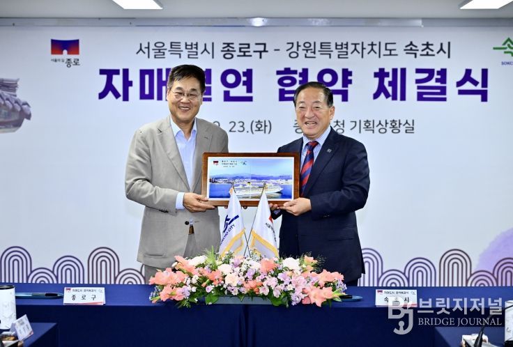 브릿지저널 윤나영 기자 | 강원특별자치도 속초시와 서울특별시 종로구는 9월 23일, 종로구청 기획상황실에서 상생발전과 활발한 교류 협력을 위한 친선결연 협약을 체결했다.