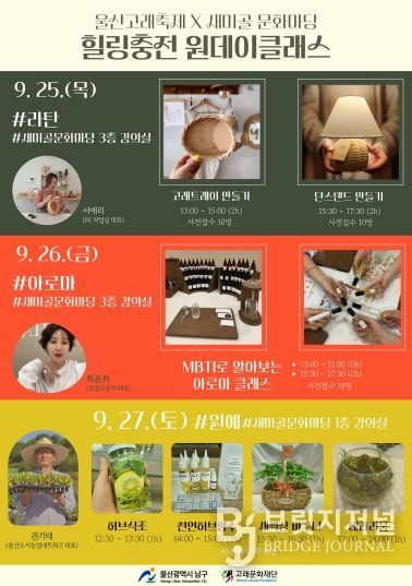 브릿지저널 윤나영 기자 | 남구고래문화재단(이사장 서동욱)은 9월 25일부터 27일까지 3일간 새미골 문화마당에서 ‘2025 울산고래축제’와 연계한 특별 프로그램인 ‘힐링충전 원데이클래스’를 운영한다고 밝혔다.