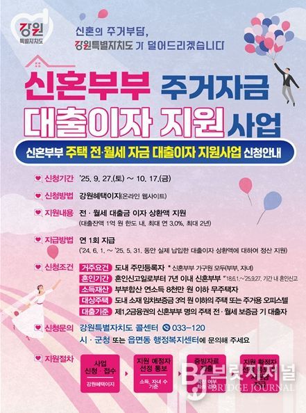 브릿지저널 윤나영 기자 | 강원특별자치도는 9월 27일부터 10월 17일까지 '신혼부부 주거자금 대출이자 지원사업' 대상자를 3차 모집한다고 밝혔다.