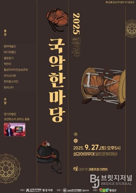 브릿지저널 윤나영 기자 | 횡성군의 가을밤을 전통의 울림으로 수놓을 '2025 횡성 국악한마당'이 오는 9월 27일 오후 5시, 섬강야외무대(열린문화마당)에서 열린다.