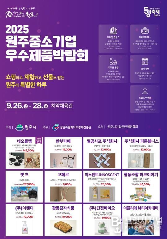 브릿지저널 윤나영 기자 | 원주시가 주최하고 강원특별자치도경제진흥원이 주관하는 ‘2025 원주 중소기업 우수제품 박람회’가 오는 26일 오전 10시 30분, 치악체육관 무대에서 개막식을 열고 28일까지 3일간 이어지는 행사의 막을 올린다.