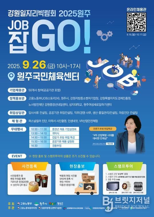 브릿지저널 윤나영 기자 | 원주시와 고용노동부는 오는 26일 오전 10시부터 오후 5시까지 원주국민체육센터에서 ‘강원일자리박람회 2025 원주 잡(JOB) GO!’를 개최한다.