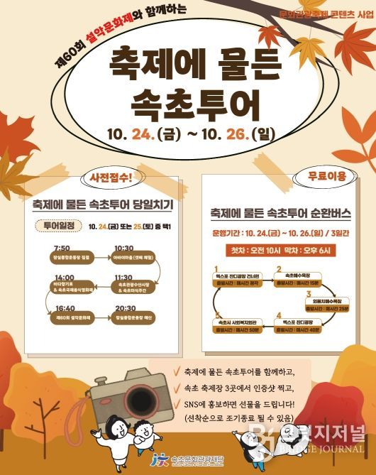 브릿지저널 윤나영 기자 | (재)속초문화관광재단은 제60회 설악문화제를 맞아 수도권 시민들이 가을 정취 가득한 속초의 대표 축제들을 한 자리에서 체험할 수 있도록 특별 기획된 문화관광 콘텐츠 ‘축제에 물든 속초투어’를 운영한다.