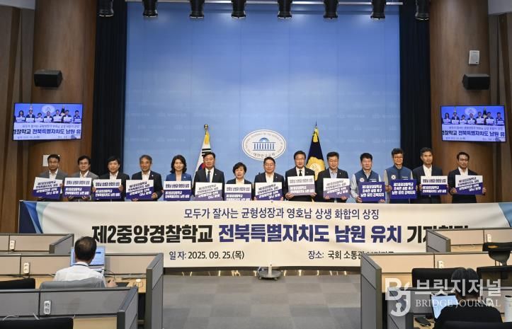 브릿지저널 윤나영 기자 | 전북특별자치도 국회의원과 전북 연고 및 영호남 국회의원들이 9월 25일 오전 국회 소통관 브리핑룸에서 '제2중앙경찰학교 전북특별자치도 남원 유치 촉구 기자회견'을 가졌다.