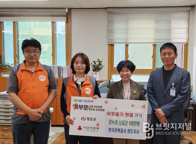 브릿지저널 정보영 기자 | 한국전력공사 청도지사(지사장 서영호)는 지난 24일 지역 내 소외계층 지원과 전통시장 활성화를 위해 온누리 상품권 100만원을 청도군에 전달했다.
