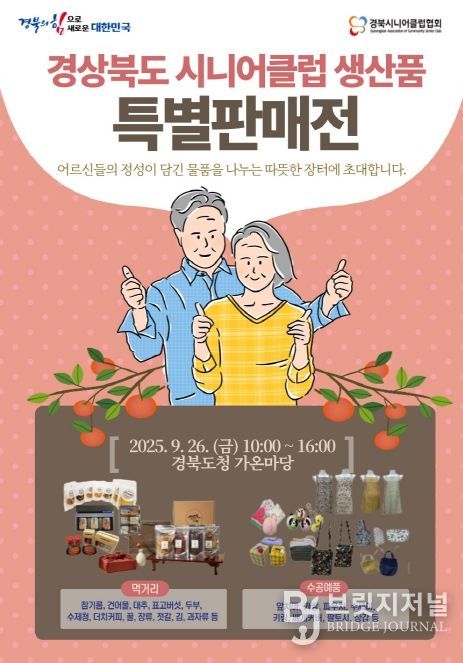 브릿지저널 정보영 기자 | 경상북도는 다가오는 추석 명절을 맞아 26일 도청 가온마당에서‘2025년 경상북도 추석맞이 노인일자리 생산품 특별판매전’을 개최한다.