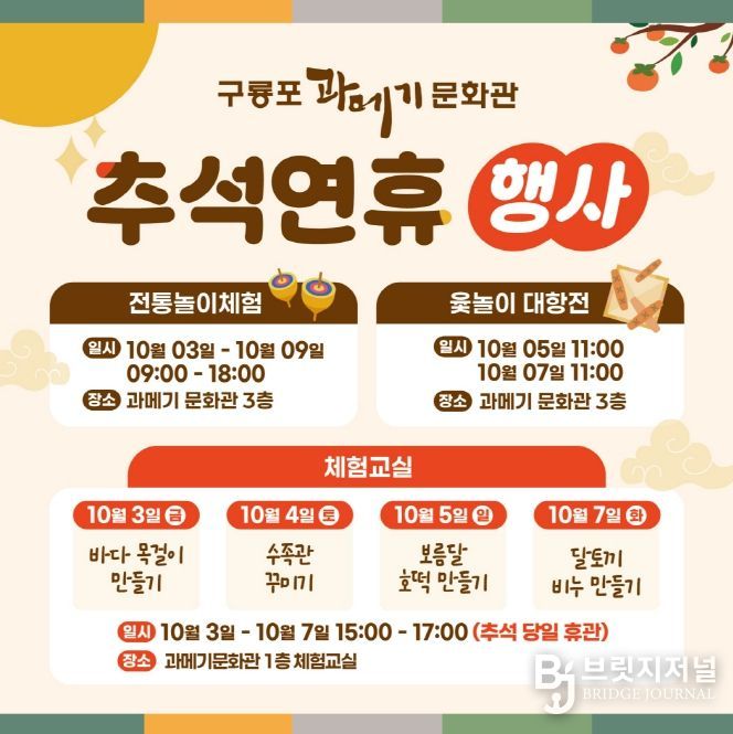이번 행사는 가족 단위 방문객들에게 전통문화와 체험학습의 기회를 제공하고, 구룡포과메기문화관이 지역민과 관광객이 함께 어울리는 명절 문화공간으로 자리매김하는 계기가 될 것으로 기대된다.