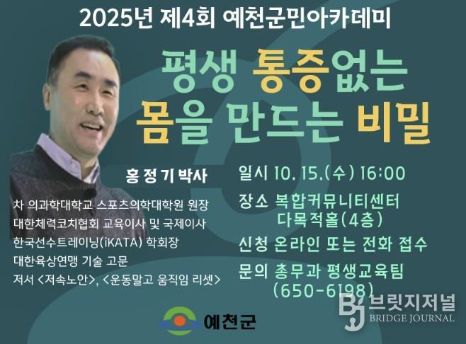 브릿지저널 정보영 기자 | 예천군은 10월 15일 오후 4시, 복합커뮤니티센터 다목적홀에서 ‘2025년 제4회 예천군민 아카데미’를 개최한다.