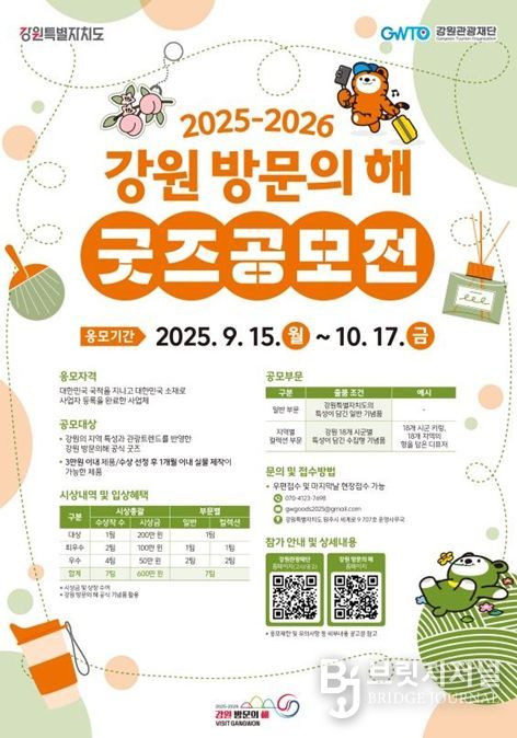 브릿지저널 윤나영 기자 | 강원특별자치도와 강원관광재단은 ‘2025-2026 강원 방문의 해’를 기념하여 독창적인 관광 기념품을 발굴하기 위한 ‘굿즈 공모전’을 개최한다.