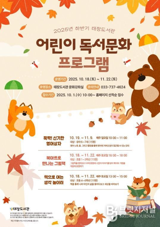 브릿지저널 윤나영 기자 | 원주시 태장도서관은 관내 어린이들을 대상으로 2025년 하반기 어린이 독서문화 프로그램을 운영한다.