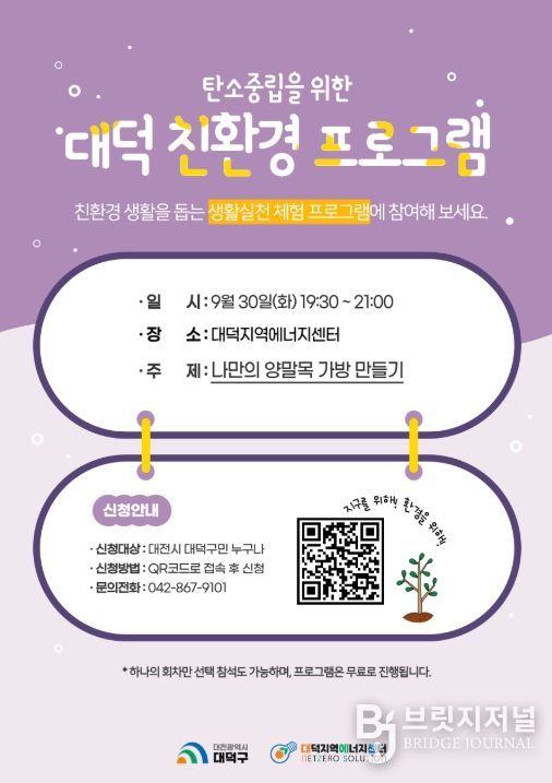 브릿지저널 정보영 기자 | 대전 대덕구는 구민이 일상에서 친환경 실천을 경험할 수 있도록 ‘대덕 친환경 프로그램’을 오는 11월까지 매월 운영한다고 밝혔다.