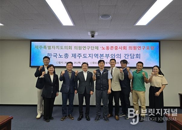 브릿지저널 정보영 기자 | 제주특별자치도의회 의원연구단체 ‘제주 노동존중사회 의원연구포럼’(대표의원 양경호)은 2025년 후반기 제주지역 노동현안 간담회의 세번째, 네번째 간담회로 제주특별자치도공무직노동조합과 한국노총제주도지역본부와 공식 간담회를 갖고, 현장 노동자들의 목소리를 직접 듣고 정책적 대응 방향을 모색했다.