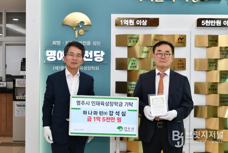 브릿지저널 정보영 기자 | (재)영주시인재육성장학회는 지난 26일, 하나마린㈜ 강석심 회장이 영주 지역 인재를 위한 장학금 1억 5천만 원을 기탁했다고 밝혔다.