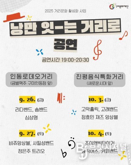 9월 26일·27일, 10월 3일·4일 총 4회 열리는 ‘로데오거리‧진평음식특화거리 활성화 공연’은 추석 연휴에 맞춰 시민과 귀성객이 함께 즐길 수 있는 열린 무대로 마련된다. 오후 7시에 시작되는 이번 공연은 ▲리다와 솜밴드, 심상명밴드가 해금·생황·카혼·기타 등 다양한 악기로 독창적인 무대를 선사하는 1회차(9. 26. 인동로데오거리), ▲비쥬앙상블, 사필성밴드, 정은주 트리오가 앙상블 연주와 재즈의 매력을 전하는 2회차(9. 27. 인동로데오거리), ▲고막홀릭, 고래밴드, 정효민 재즈 앙상블이 가을밤을 재즈 선율로 물들이는 3회차(10. 3. 진평음식특화거리), ▲조이앤빅타이거, 뮤직어스, 커피밴드가 거리를 열정과 낭만으로 채우는 4회차(10. 4. 진평음식특화거리) 공연으로 구성된다. ‘문화가 스며드는 거리’라는 콘셉트 아래 거리를 공연장으로 바꿔 새로운 문화 경험을 시민들에게 선사한다.