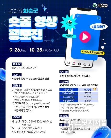 브릿지저널 김경미 기자 | 화순군은 26일 최신 영상 트렌드인 ‘숏폼(short-form)’을 활용해 군민과 공직자의 자발적인 참여를 유도하고, 지역 홍보 역량을 강화하고자 '2025 화순군 숏폼 영상 공모전'을 개최한다고 밝혔다.