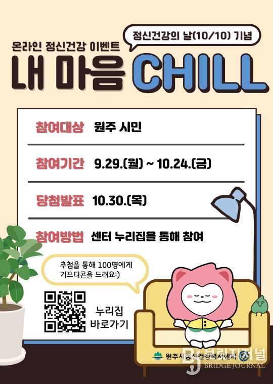 브릿지저널 윤나영 기자 | 원주시정신건강복지센터는 정신건강의 날(10월 10일)을 기념해 9월 29일부터 10월 24일까지 온라인 정신건강 이벤트 ‘내 마음 칠(CHILL)’을 진행한다.