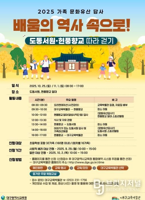 브릿지저널 김진석 기자 | 대구교육박물관은 오는 10월 25일과 11월 1일, 두 차례에 걸쳐 초등학생 가족들을 대상으로 ‘배움의 역사 속으로! 도동서원·현풍향교 따라 걷기’가족문화유산답사 프로그램을 운영한다.
