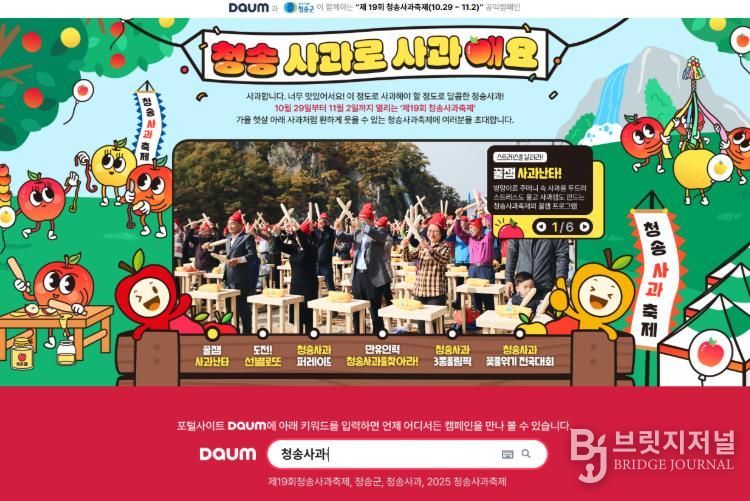 브릿지저널 정보영 기자 | 청송군은 29일부터 포털사이트 다음(daum)에서 11월 2일까지 '제19회 청송사과축제' 온라인 축제를 개최한다.