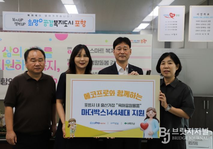 브릿지저널 정보영 기자 | 포항시는 지난 25일 에코프로가 시청을 방문해 저출산 극복에 힘을 보태고, 지역 내 저소득 출산 가정을 지원하기 위해 ‘마더박스’ 144세트(3,600만 원 상당)를 기탁했다고 밝혔다.