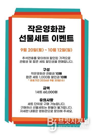 브릿지저널 정보영 기자 | 성주별고을시네마(창의문화센터 3층)는 민족 대명절 추석을 맞아 9월 20일부터 10월 12일까지 ‘추석맞이 선물세트 이벤트’를 진행한다.