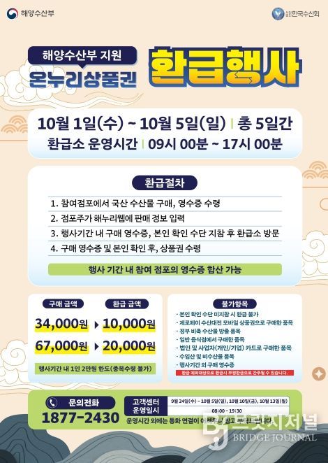 브릿지저널 김경미 기자 | 청주시는 추석을 맞아 수산물 소비 활성화를 위해 10월 1일부터 5일까지 전통시장 온누리상품권 환급행사를 추진한다.