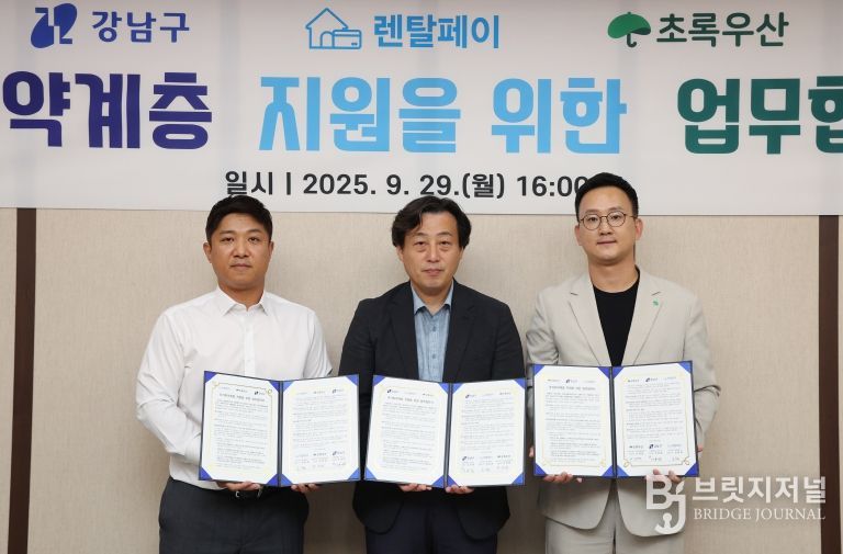 브릿지저널 김경미 기자 | 꿈이 모이는 도시, 미래를 그리는 강남구가 9월 29일 렌탈페이, 초록우산과 함께 주거취약계층 지원을 위한 3자간 업무협약(MOU)을 체결했다.