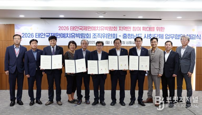 브릿지저널 정보영 기자 | 2026 태안국제원예치유박람회 조직위원회는 29일 도청 상황실에서 도내 4개 사회단체와 박람회 성공 개최를 위한 협력을 다짐하는 업무협약을 체결했다.