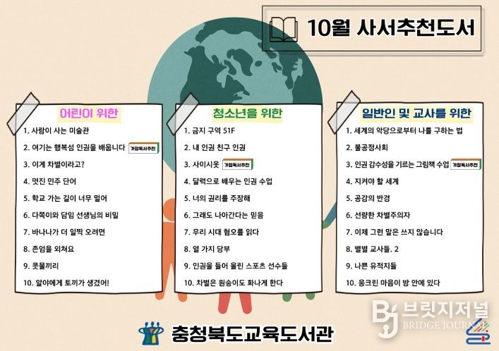 브릿지저널 김경미 기자 | 충청북도교육청 직속기관 교육도서관은 '사람답게 살고 있습니까, 휴먼?(인권)'을 주제로 2025년 언제나 책봄 열두달 북큐레이션 10월 사서추천도서 30권을 선정했다.