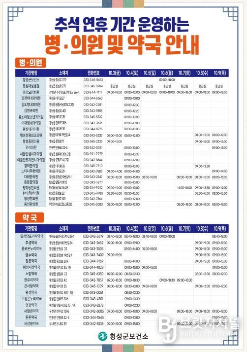 브릿지저널 윤나영 기자 | 횡성군은 2025년 추석 연휴를 맞아 군민들의 건강과 안전을 보호하기 위해 10월 3일부터 10월 9일까지 7일간 특별대응기간을 설정하고, 응급진료체계를 강화한다고 30일 밝혔다.