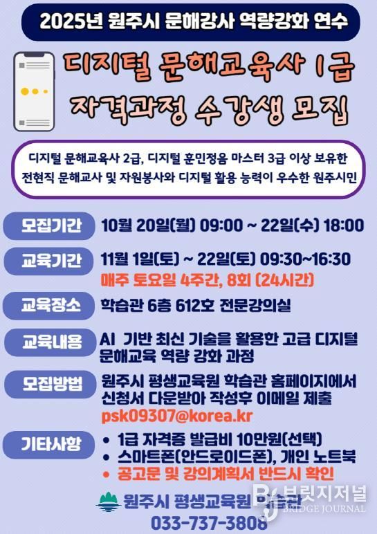브릿지저널 윤나영 기자 | 원주시 평생교육원 학습관은 문해교육의 질적 향상과 교사의 전문성 강화를 위해 11월 1일부터 22일까지 ‘문해강사 보수교육 역량강좌’를 운영한다.