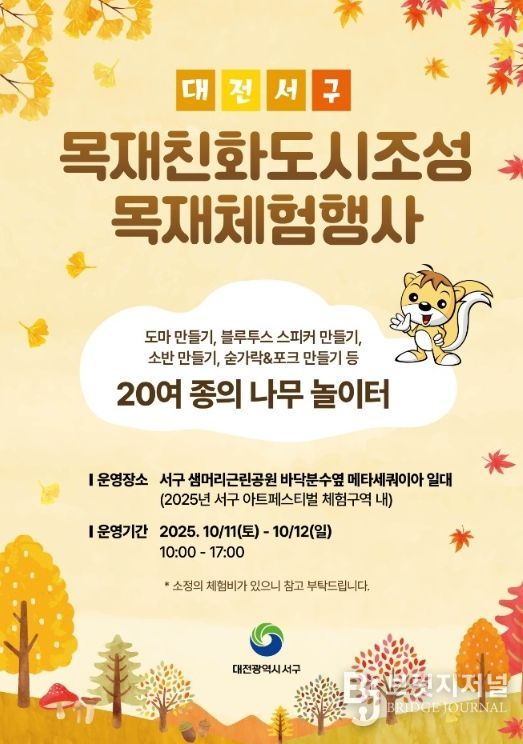 브릿지저널 정보영 기자 | 대전 서구는 다음 달 10일부터 12일까지 3일간 샘머리근린공원에서 개최되는 ‘2025 서구 아트페스티벌’과 연계해, 목재 문화 확산을 위한 ‘목재 친화 도시 조성 목재 체험 행사’를 함께 진행한다.