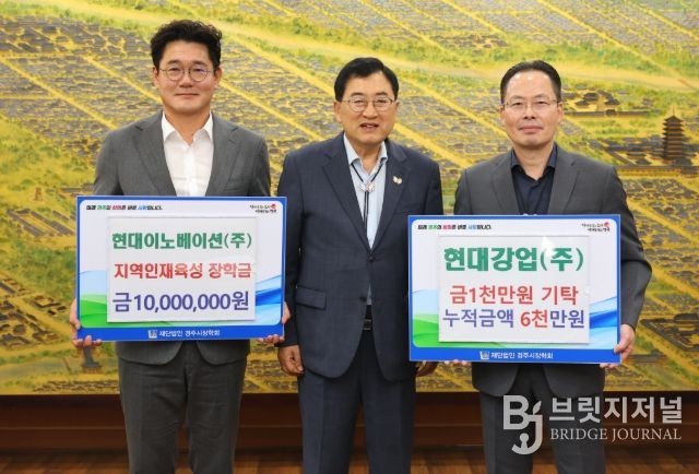 브릿지저널 정보영 기자 | 현대강업(주)(회장 이상춘)과 자회사 현대이노베이션(주)(대표 양희성)은 30일 지역 인재 육성과 교육 발전을 위해 각각 1,000만 원씩, 총 2,000만 원의 장학금을 (재)경주시장학회에 기탁했다.