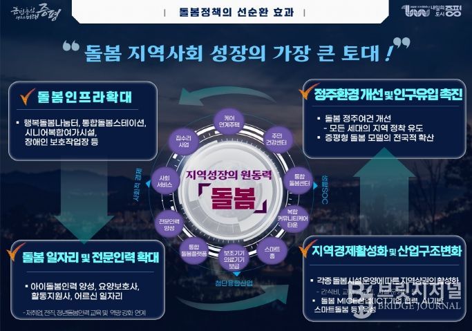이재영 군수는 “돌봄은 복지를 넘어 일자리와 산업을 창출하고, 지역 경제와 공동체를 성장시키는 힘”이라며 “증평형 돌봄이 대한민국의 새로운 표준이 되도록 모든 역량을 집중하겠다”고 밝혔다.