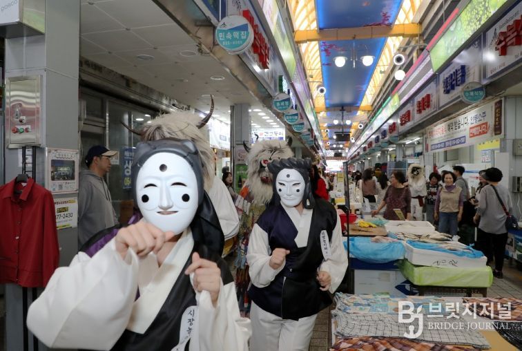 브릿지저널 정보영 기자 | 9월 29일 오후, 안동 구시장 일대가 흥겨운 퍼레이드로 활기를 띠었다. 안동국제탈춤페스티벌 기간 동안 안동의 구시장, 신시장, 용상시장이 매일 흥겨운 퍼레이드 무대로 변신한다. 축제 개막일을 제외한 9일간 매일 이어지는 시장 퍼레이드는 상인과 시민, 관광객이 함께 어울리며 시장 골목을 축제의 한복판으로 만든다.