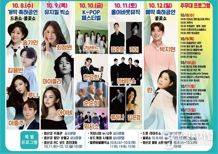 이번 축제는 5일간 이어지는 다양한 공연과 체험 프로그램을 통해 나주의 역사와 문화를 알리고, 영산강의 아름다움을 예술로 풀어낸다. 무엇보다도 송가인, 최정원, 마이클 리, 아이비, 김호영, 카이, 린, 박지현 등 국내 최정상급 아티스트와 K-POP 스타들이 총출동해 ‘레전드 라인업’으로 손꼽히는 이번 영산강축제는 그 어느 해보다 큰 관심을 끌고 있다.