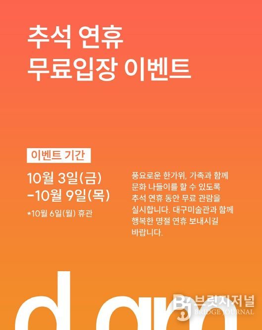 브릿지저널 김진석 기자 | 대구문화예술진흥원대구미술관은 추석 당일인 10월 6일 휴관하고, 연휴 기간인 3일부터 9일까지 무료 개관해 시민들의 명절 문화생활을 함께 한다.