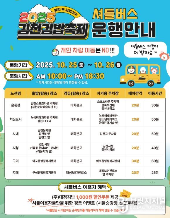 브릿지저널 정보영 기자 | 김천시는 오는 10월 25일부터 26일까지 직지사 사명대사공원 일원에서 개최되는 '2025 김천김밥축제'의 성공적인 개최를 위해 교통종합대책을 발표했다.