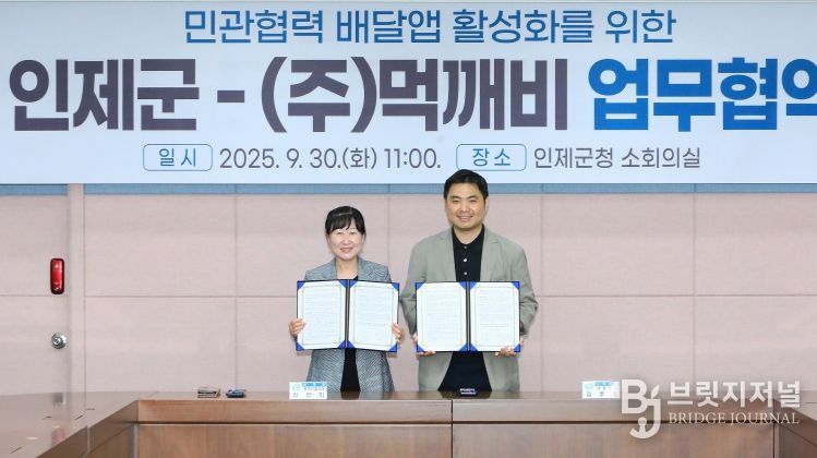 브릿지저널 윤나영 기자 | 인제군은 9월 30일 군청 소회의실에서 민관협력 배달앱 ‘먹깨비’ 운영사와 업무 협약을 체결하고, 지역 소상공인 경영 안정과 군민 편익 증진을 위한 본격적인 협력에 나섰다.