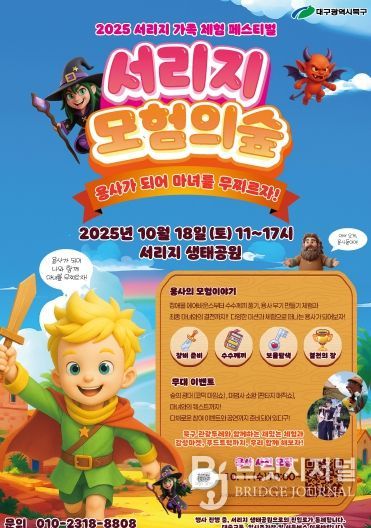 브릿지저널 김진석 기자 | 대구 북구청은 오는 10월 18일 동호동 서리지 생태공원 일원에서 '2025 서리지 가족 체험 페스티벌 – 서리지, 모험의 숲'을 개최한다고 밝혔다.