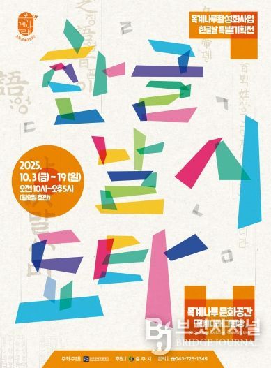브릿지저널 김경미 기자 | 충주문화관광재단은 오는 10월 3일, 목계나루문화공간(강배체험관) 일원에서 시민과 함께하는 특별 기획전'한글날시됴타'를 개최한다고 밝혔다.