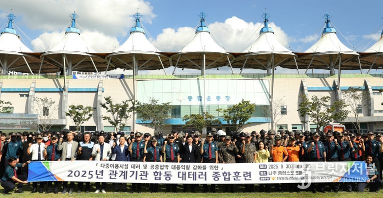브릿지저널 김경미 기자 | 전남경찰청은 나주종합스포츠파크에서 국가정보원(광주지부), 육군 제31보병사단, 제11공수특전여단, 공군 제1전투비행단, 전남소방본부, 영산강유역환경청 등 10개 기관 250여명이 참여한 가운데 관계기관 합동 대테러 종합훈련을 실시했다.
