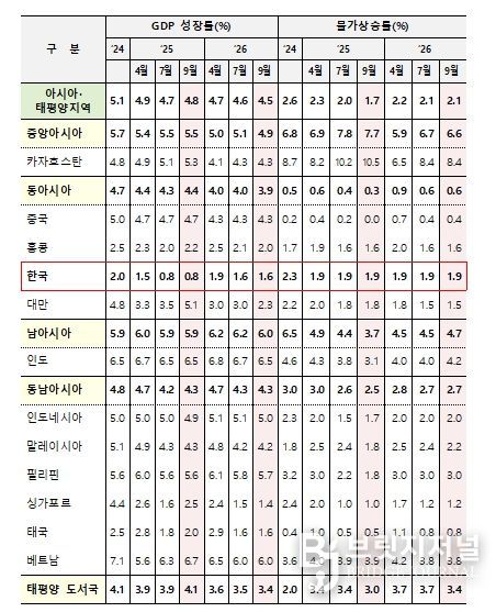 한편, 아시아개발은행은 한국의 ’25년 성장률에 대해서는 7월에 발표한 전망치인 0.8%를 유지했다. 7월 전망은 건설투자 감소, 수출 둔화, 부동산시장 약세 등을 반영하여 4월 전망에 비해 0.7%p 하향 조정된 바 있다. 아시아개발은행은 건설경기 부진, 미국의 관세 인상 및 관련 불확실성 등이 지속되면서 7월 전망치를 유지했으나, 정부의 확장적 재정정책과 완화된 통화정책은 하반기 내수 회복에 기여할 것이라고 평가했다. 아울러 ’26년 경제성장률도 7월과 동일한 1.6%로 전망했다.