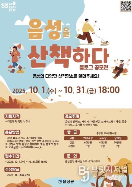 브릿지저널 김경미 기자 | 음성군이 지역 곳곳의 아름다운 산책 명소의 매력을 알리기 위해 지난 1일부터 이달 31일까지 ‘2025년 음성군 블로그 공모전’을 개최한다.
