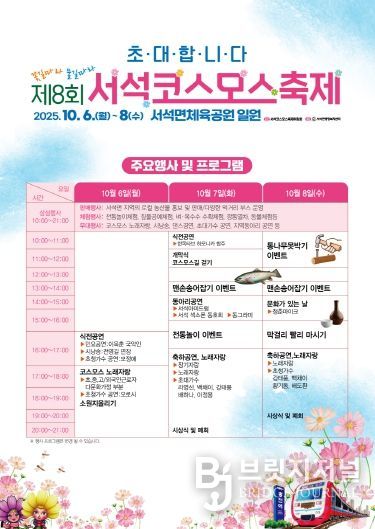 라주호 축제위원장은 “코스모스 향연과 함께 주민이 직접 참여하는 먹거리와 농특산물 판매장이 축제의 진정한 매력이 될 것”이라며, “추석 연휴 동안 많은 분들이 서석면을 찾아 맛과 멋, 그리고 따뜻한 정을 함께 나누길 바란다”라고 전했다.