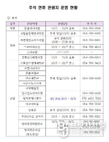 브릿지저널 정보영 기자 | 울진군은 다가오는 2025년 추석연휴(10월 3일 ~ 10월 9일)를 맞아 울진을 방문하는 관광객이 편리하게 여행할 수 있도록 주요 관광지 휴무 현황과 다양한 이벤트 ․ 행사 일정을 공개했다.