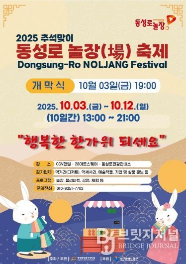 브릿지저널 김진석 기자 | 대구 중구는 10월 3일부터 12일까지 10일간 동성로 보행자전용도로 일원에서 ‘동성로에서 놀며 장보자!’라는 테마로 ‘2025 추석맞이 동성로 놀장(場) 축제’를 개최한다.