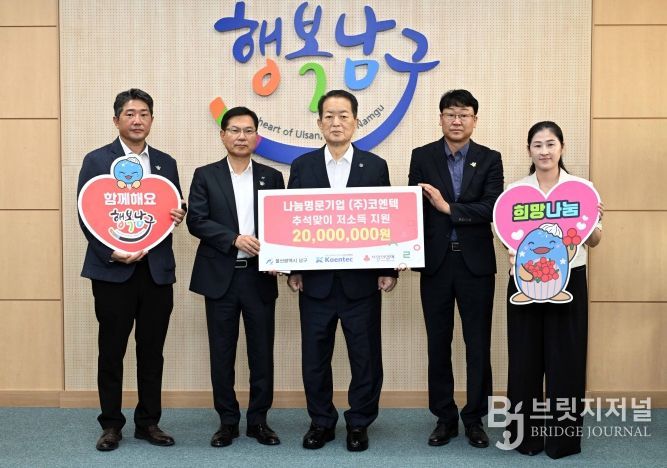 브릿지저널 윤나영 기자 | ㈜코엔텍(대표이사 김재일)은 1일 남구청을 방문해 추석을 맞아 남구 관내 저소득층을 위한 후원금 2,000만 원을 전달했다.
