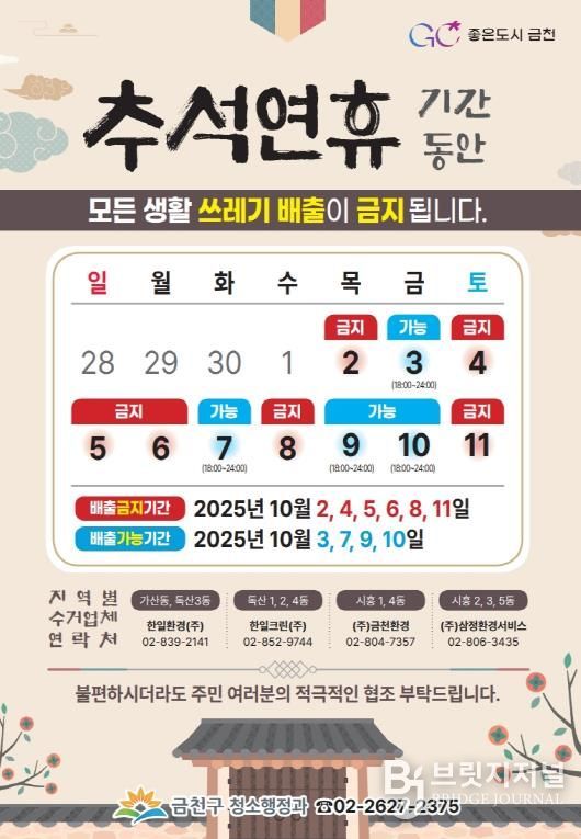 브릿지저널 김경미 기자 | 금천구는 추석 연휴 기간 생활쓰레기(일반생활쓰레기, 음식물쓰레기, 재활용품) 수거를 일시 중단한다고 밝혔다.